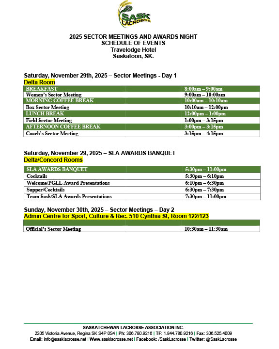 For anyone interested in joining the SLA Board as a Sector Chair for the 2026 year, they must be in good standing with the SLA and be nominated for the role. There are five Sector Chair positions available, Field, Box, Women's, Coaching, and Officiating. This form is due by midnight on November 22, no late submissions will be accepted. The nomination form is located at this link:
